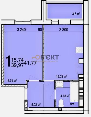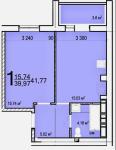 Площадь: Общая — 41.77 м². Уникальная планировка с большой кухней — 15.3 м² и жилой комнатой — 15.74 м².