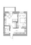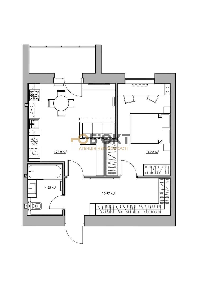 Планировка: Огромная общая площадь 52 м² позволила создать комфортную кухню-студию (12 м²) и отдельную уютную спальню (14 м²).